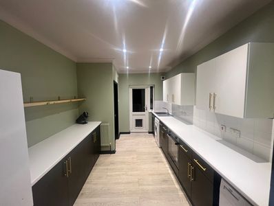 We protected the freshly sprayed kitchen surfaces and worktops, unfortunately, the interior décor was not completed to a very good standard, therefore we sanded the walls back using our dustless machine sander to achieve that high spec finish that complemented the newly sprayed surfaces.